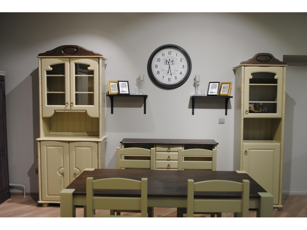 Цвет серванта на титульной фотографии - бесцветный лак. При заказе мебели в составном цвете цена считается по более дорогому. Резные накладки красят в цвет боковин.