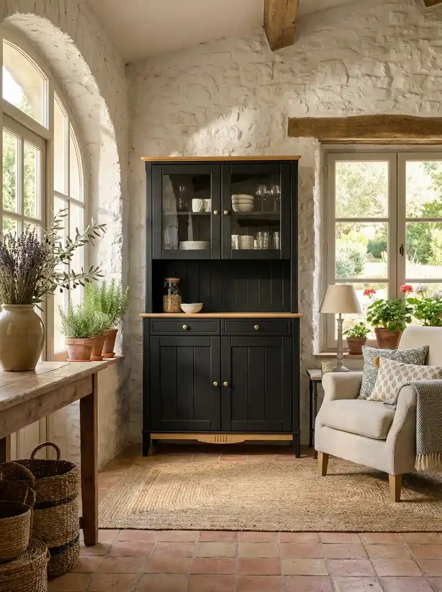 Буфет состоит из двух элементов: нижнего комода с двумя ящиками и двумя дверцами, а также верхней надстройки со стеклянными фасадами. Между ними образуется удобная открытая ниша — идеальное место для хранения или декоративной композиции.