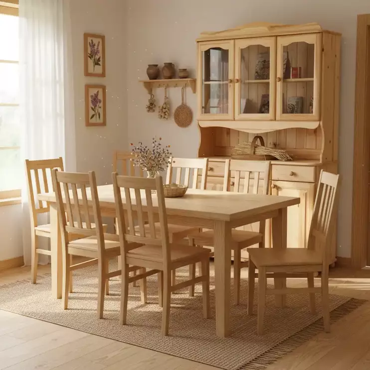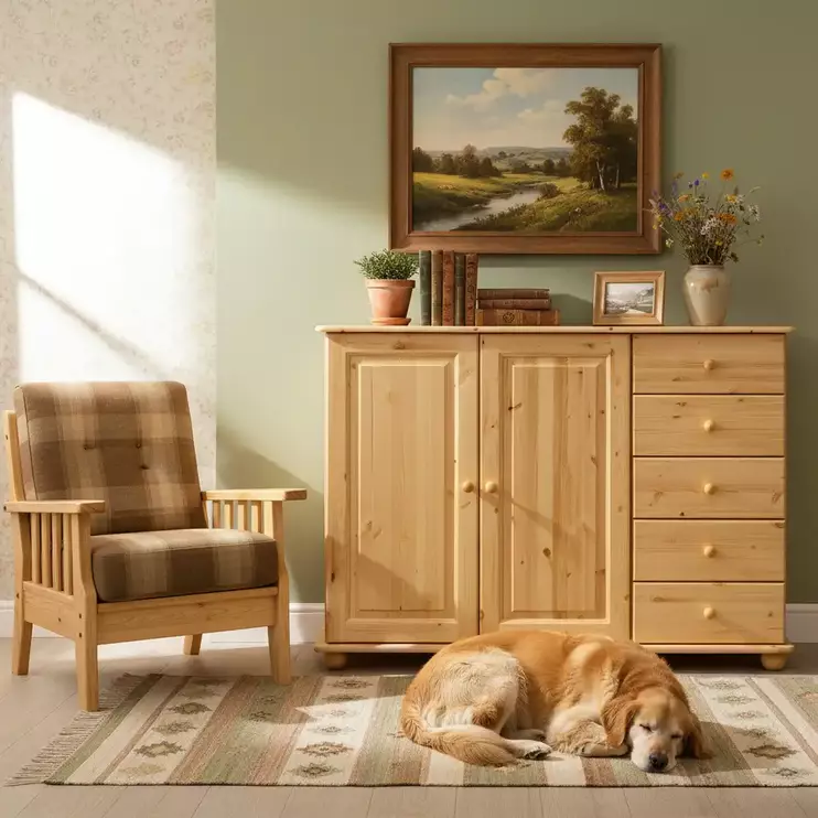 Корпуса, фасады, столешницы и залицовки ящиков изготавливаются из бессучкового массива сосны, отсортированного вручную. Задние стенки предметов и донья ящиков выполняются из ДВП. Ящики выдвигаются и задвигаются на роликовых направляющих без доводчиков. Максимальная нагрузка на направляющие 20 кг.